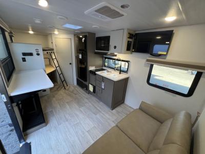 You can make yourself at home with solid pressed membrane countertops, 4k interior LED lights, and black roller shades for added privacy. The outside shower with hot and cold water will let you easily wash off camp gear, and the marine grade exterior speakers will allow you to be the life of the campground. You will also appreciate the universal docking station for easy access to your hookups, plus a high-output on-demand tankless water heater for hot water when you need it.