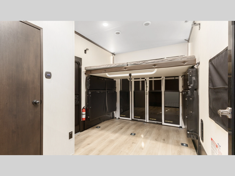 There is a 3,000 lb. rated ramp door on each model, along with DuraPoxy gas/oil resistant flooring, and 5,000 lbs. tie-downs to keep your toys secure on the way to the campground. You can enjoy your toy hauler for years to come thanks to the aluminum frame sidewalls and radius PVC walk-on roof, and the 102" wide body construction will make it easier than ever to load up dirt bikes, four-wheelers, or kayaks! Inside, you'll love the zebra shades in the living areas, the glass shower doors, the quick set garage bed system, and many more comforts!