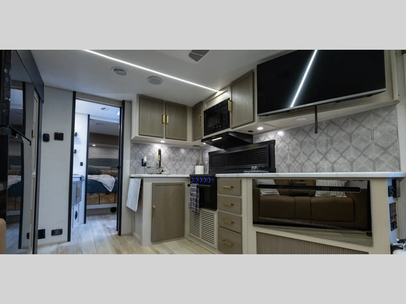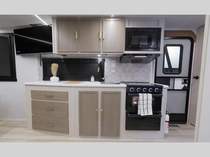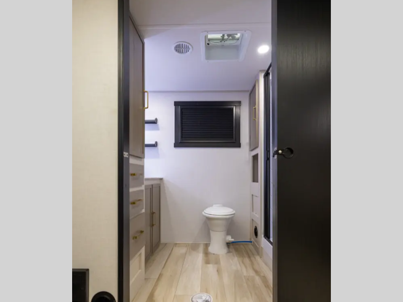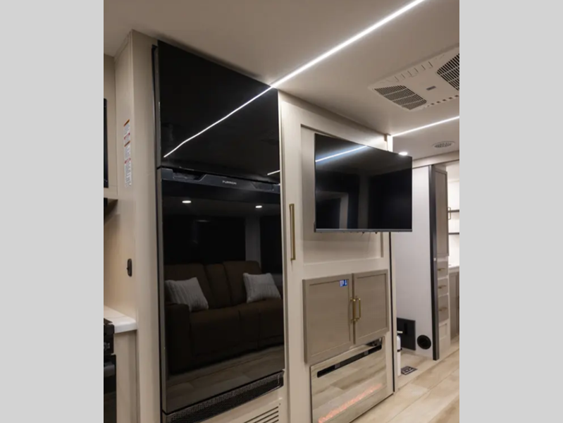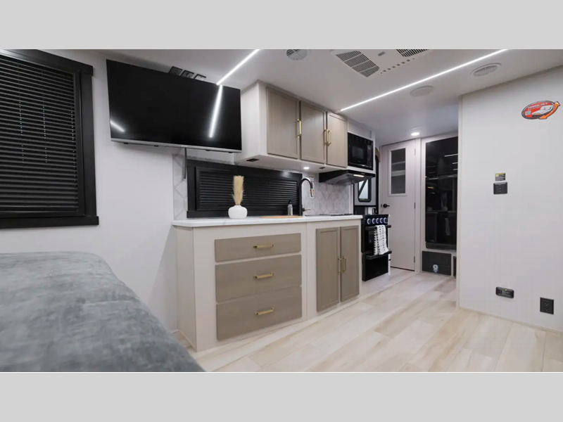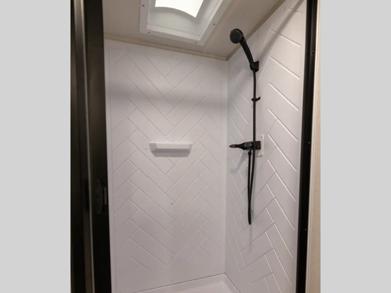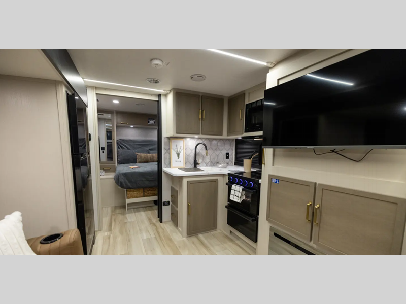 Sleeps 3 Slides 1 Length 30 ft 10 in Ext Width 8 ft Ext Height 10 ft 10 in Hitch Weight 920 lbs Dry Weight 6678 lbs Cargo Capacity 1242 lbs Fresh Water Capacity 49 gals Grey Water Capacity 62 gals Black Water Capacity 32 gals Available Beds Queen with Versa Tilt Refrigerator Type 12V Black Refrigerator Size 10 cu ft Cooktop Burners 3 Shower Size 30" x 36" Number of Awnings 1 Water Heater Type On Demand Tankless AC BTU 15000 btu TV Info LR 40" LED Smart TV Awning Info 18' w/LED Lights Axle Count 2 Shower Type Walk-In Shower Similar Floorplans