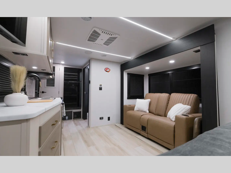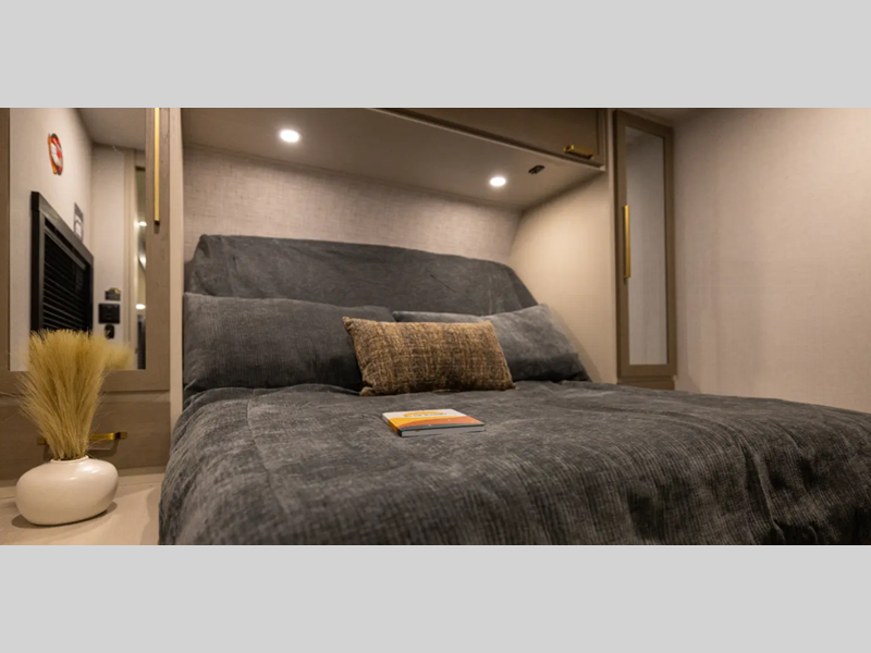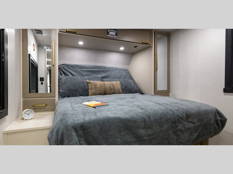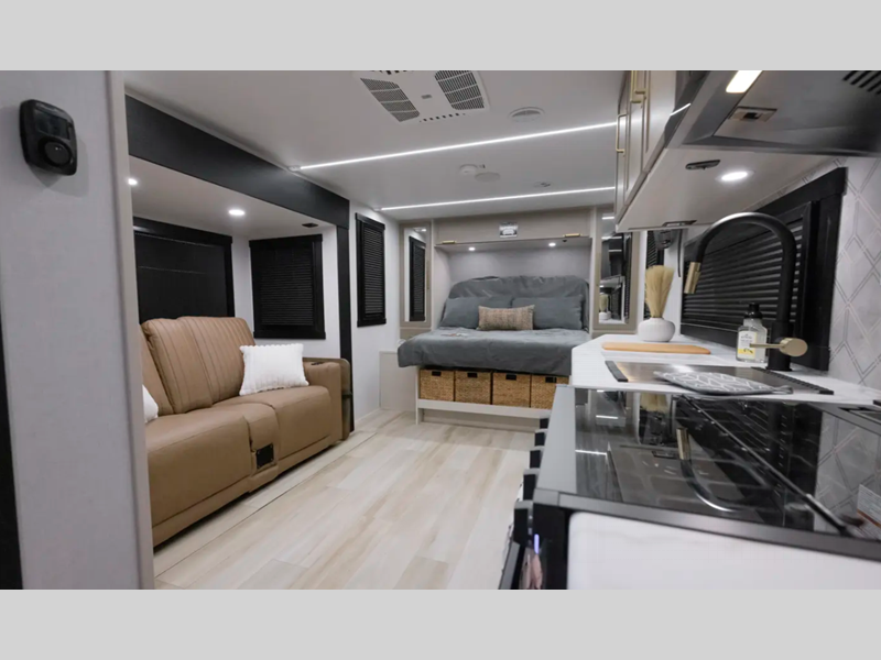 Sleeps 2 Slides 1 Length 24 ft Ext Width 8 ft Ext Height 10 ft 10 in Hitch Weight 785 lbs Dry Weight 5403 lbs Cargo Capacity 2382 lbs Fresh Water Capacity 49 gals Grey Water Capacity 62 gals Black Water Capacity 32 gals Tire Size 15" Available Beds Queen with Versa Tilt Refrigerator Type 12V Black Refrigerator Size 10 cu ft Cooktop Burners 3 Shower Size 30" x 36" Number of Awnings 1 Water Heater Type On Demand Tankless AC BTU 15000 btu TV Info LR 40" LED Smart TV Awning Info 14' w/LED Lights Axle Count 2 Shower Type Walk-In Shower Similar Floorplans