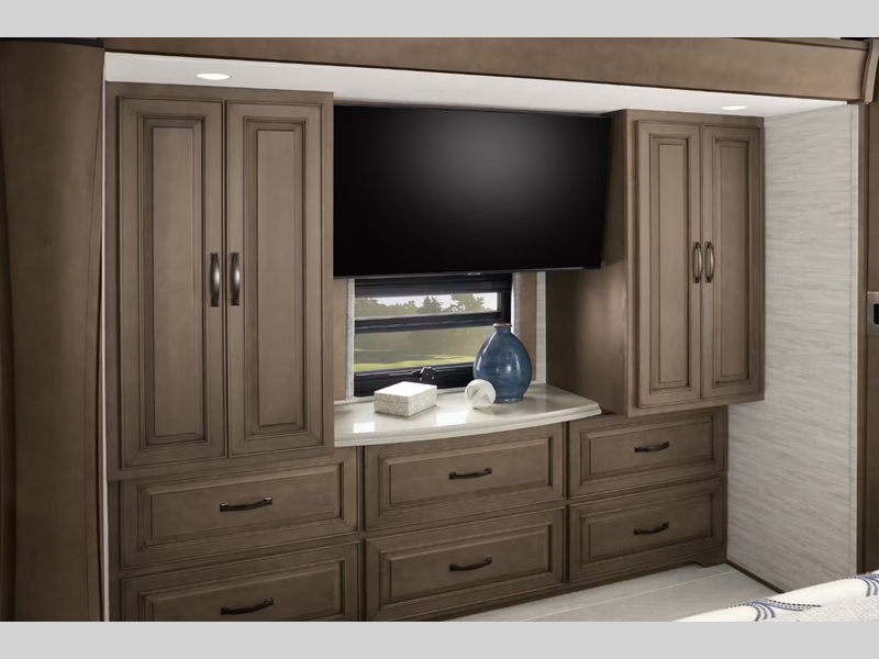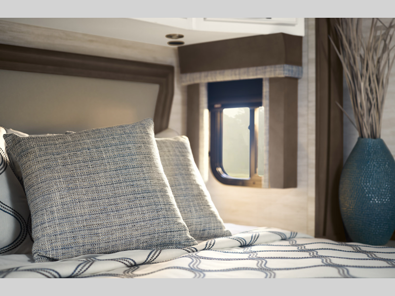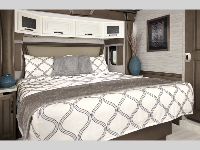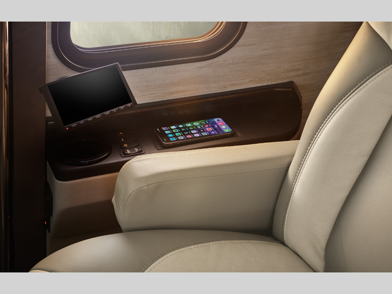 The exterior full-paint Masterpiece Finish is an industry exclusive, and it will attract every eye on the road. These luxurious coaches are absolutely filled to the brim with enticing amenities, like the convection microwave, Samsung LED TV, Bose sound bar sound system, and Xite dash radio with 9" monitors. There is also a Nav-N-Go navigation system, Villa Comfort Fit furniture, plush pillowtop mattress, and wireless phone charging mat.