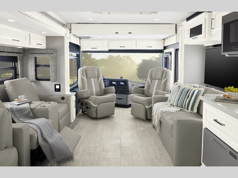Sleeps 5 Slides 3 Length 43 ft 10 in Ext Width 8 ft 6 in Ext Height 13 ft 1 in Int Height 6 ft 11 in Interior Color Brighton, Palisades, Saguaro Exterior Color Cider, Ebony, Sky Hitch Weight 15000 lbs GVWR 45600 lbs Dry Weight 36950 lbs Cargo Capacity 8650 lbs Fresh Water Capacity 105 gals Grey Water Capacity 75 gals Black Water Capacity 55 gals Furnace BTU 50000 btu Generator 8.0 kW Cummins Onan Diesel Quiet Series Fuel Type Diesel Engine Cummins L 8.9 Chassis Freightliner XCR Tag Axle Horsepower 400 hp Fuel Capacity 100 gals Wheelbase 281 in Available Beds King Torque 1250 ft-lb Refrigerator Type Whirlpool Refrigerator Size 19.7 cu ft Convection Cooking Yes Cooktop Burners 2 Shower Size 50" x 34" Number of Awnings 1 Axle Weight Front 15600 lbs Axle Weight Rear 20000 lbs Axle Weight Tag 10000 lbs Water Heater Type Continuous AC BTU 45000 btu TV Info LR 50" Samsung LED 4K TV on Televator, BR Samsung LED 4K Awning Info Girard G2000 Power w/Wind Sensor, Remote, and LED Lights Washer/Dryer Available Yes Gross Combined Weight 60600 lbs Shower Type Shower w/Seat Electrical Service 50 amp Similar Floorplans