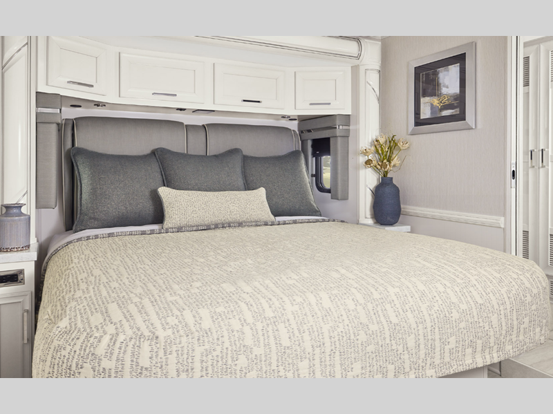 Sleeps 5 Slides 3 Length 40 ft 10 in Ext Width 8 ft 6 in Ext Height 12 ft 11 in Int Height 6 ft 11 in Interior Color Brighton, Palisades, Saguaro Exterior Color Cider, Ebony, Sky Hitch Weight 15000 lbs GVWR 45000 lbs Dry Weight 35900 lbs Cargo Capacity 9100 lbs Fresh Water Capacity 105 gals Grey Water Capacity 75 gals Black Water Capacity 55 gals Furnace BTU 50000 btu Generator 8.0 kW Cummins Onan Diesel Quiet Series Fuel Type Diesel Engine Cummins L 8.9 Chassis Freightliner XCR Tag Axle Horsepower 400 hp Fuel Capacity 100 gals Wheelbase 245 in Available Beds King Torque 1250 ft-lb Refrigerator Type Whirlpool Refrigerator Size 19.7 cu ft Convection Cooking Yes Cooktop Burners 2 Shower Size 50" x 30" Number of Awnings 1 Axle Weight Front 15000 lbs Axle Weight Rear 20000 lbs Axle Weight Tag 10000 lbs Water Heater Type Continuous AC BTU 30000 btu TV Info LR 50" Samsung LED 4K TV on Televator, BR Samsung LED 4K Awning Info Girard G2000 Power w/Wind Sensor, Remote, and LED Lights Washer/Dryer Available Yes Gross Combined Weight 60000 lbs Shower Type Standard Electrical Service 50 amp Similar Floorplans