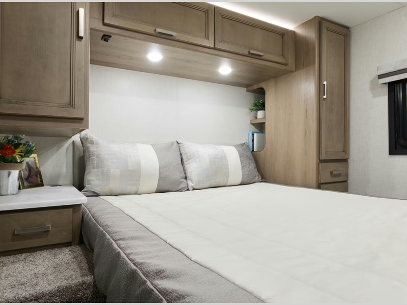 The 14" touchscreen dash radio in the cab comes with Bluetooth, Android Auto, and Apple CarPlay, and it is ready for SiriusXM radio. The reclining/swivel leatherette captain's chairs are super comfortable, and they can even serve as an additional lounge spot for the rest of the living area when you swivel them around. The Vegas kitchen is ready to help you make meals on the go, and you will find the 12V double-door refrigerator, two-burner gas cooktop, and convection microwave to be quite useful. You will also appreciate the durable premium one-piece domed roof membrane, the 15,000 BTU A/C, and the tankless water heater for endless hot water when you need it.