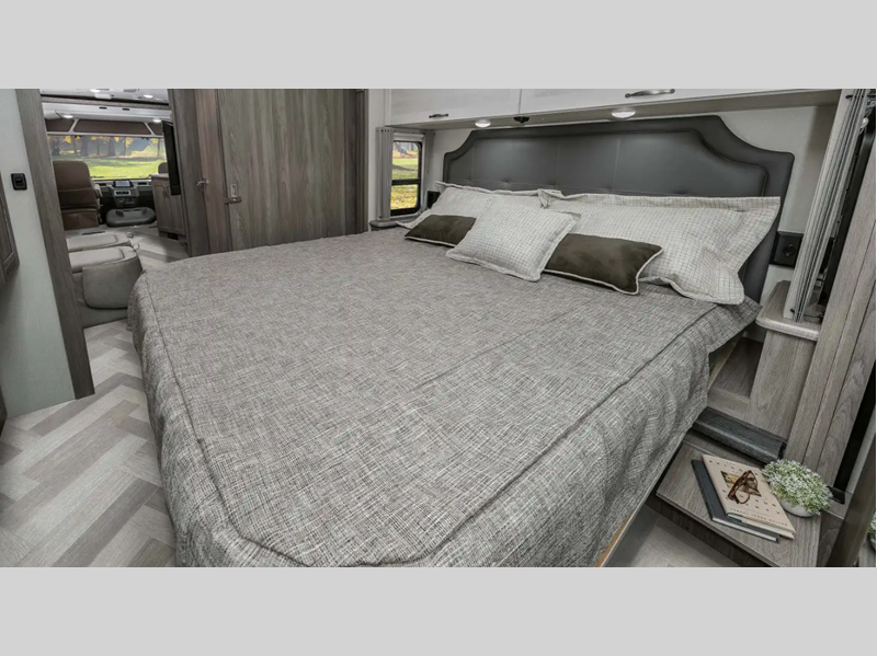 Sleeps 5 Slides 2 Length 35 ft 10 in Ext Width 8 ft 6 in Ext Height 12 ft 1 in Int Height 6 ft 10 in Interior Color Organic Comfort Dark, Organic Comfort Light, Bohemian Oasis Exterior Color Full-Body Paint; Silvermist, Wedgewood ll, Steel Grey, Night Sky Hitch Weight 5000 lbs GVWR 22000 lbs Fresh Water Capacity 74 gals Grey Water Capacity 51 gals Black Water Capacity 63 gals Tire Size 22.5" Furnace BTU 40000 btu Generator 5,500-Watt Cummins Onan Marquis Gold Fuel Type Gas Engine 7.3L V8 Chassis Ford F53 Fuel Capacity 80 gals Wheelbase 228 in Available Beds King Refrigerator Type Stainless Steel Residential with Ice Maker and Water Dispenser Convection Cooking Yes Cooktop Burners 3 Shower Size 36" x 36" Number of Awnings 1 Axle Weight Front 8000 lbs Axle Weight Rear 15000 lbs LP Tank Capacity 76.14 lbs Water Heater Capacity 10 gal Water Heater Type 110V/LP AC BTU 28500 btu Basement Storage 137 cu. ft. TV Info LR 39" HDTV, BR 32" HDTV, Ext. 32" HDTV Awning Info 16' Power w/LED Lighting Washer/Dryer Available Yes Gross Combined Weight 26000 lbs Shower Type Standard Electrical Service 50 amp Similar Floorplans