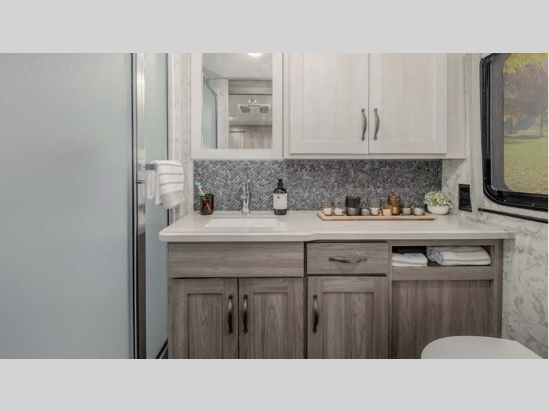 Sleeps 5 Slides 2 Length 35 ft 6 in Ext Width 8 ft 6 in Ext Height 12 ft 1 in Int Height 6 ft 10 in Interior Color Organic Comfort Dark, Organic Comfort Light, Bohemian Oasis Exterior Color Full-Body Paint; Silvermist, Wedgewood ll, Steel Grey, Night Sky Hitch Weight 5000 lbs GVWR 22000 lbs Fresh Water Capacity 75 gals Grey Water Capacity 57 gals Black Water Capacity 48 gals Tire Size 22.5" Furnace BTU 40000 btu Generator 5,500-Watt Cummins Onan Marquis Gold Fuel Type Gas Engine 7.3L V8 Chassis Ford F-53 Fuel Capacity 80 gals Wheelbase 228 in Available Beds King Refrigerator Type Stainless Steel Residential with Ice Maker and Water Dispenser Convection Cooking Yes Cooktop Burners 2 Shower Size 34" x 34" Number of Awnings 1 Axle Weight Front 8000 lbs Axle Weight Rear 15000 lbs LP Tank Capacity 76.14 lbs Water Heater Capacity 10 gal Water Heater Type 110V/LP AC BTU 28500 btu Basement Storage 122 cu. ft. TV Info LR 50" HDTV, BR 32" HDTV, Ext. 32" HDTV Awning Info 19' Power w/LED Lighting Washer/Dryer Available Yes Gross Combined Weight 26000 lbs Shower Type Radius Electrical Service 50 amp Similar Floorplans
