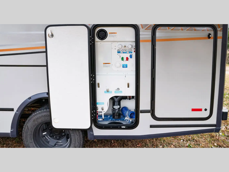 - Insulated water service center houses water center control panel, hooks, cable tv input, freshwater drain and portable satellite dish hook-up