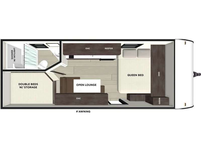 The double-size bunks with storage will be a big selling point in this travel trailer! While your guests take the bunks, you can have the front queen bed all to yourselves, and there is a wardrobe to keep your things organized. A two burner cooktop and microwave will let you make meals each day, and you can dine at the open lounge with a table.