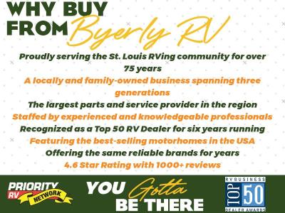 Byerly RV is not responsible for any misprints, typos, or errors found in our website pages. Any price listed excludes sales tax, registration tags, and delivery fees. Manufacturer-provided pictures, specifications and features may be used as needed. Inventory shown may be only a partial listing of the entire inventory. Please contact us at 636-938-2000 for availability as our inventory changes rapidly. All calculated payments are an estimate only and do not constitute a commitment that financing or a specific interest rate or term is available.